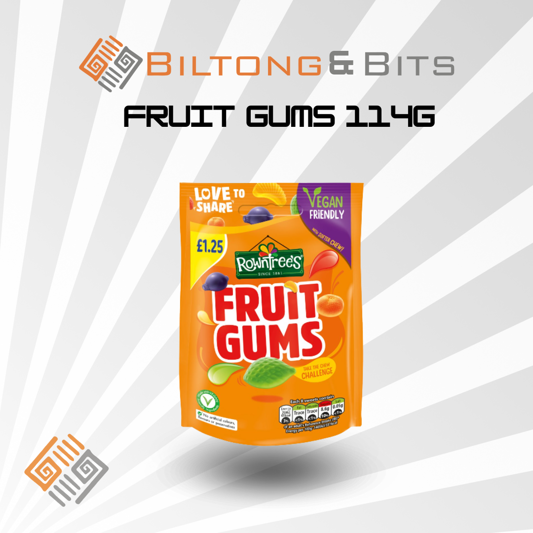 Enjoy the timeless taste of Rowntree’s Fruit Gums (114 g). These classic chewy sweets are made with real fruit juice and come in a variety of fruity flavors including blackcurrant, strawberry, orange, lemon, and lime.